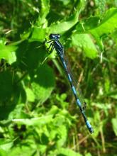 Espèce protégé. Le mâle a le corps bleu et noire, avec un dessin de tête de taureau sur le deuxième segment. La femelle est verte avec la face dorsale de l’abdomen noir. Les deux ont les ailes repliées au repos. On la trouve dans des zones humides et cours d’eau. Elle se reproduit dans les eaux courantes claires et bien oxygénées, avec de la végétation. La larve va rester sous cette forme pendant une vingtaine de mois.