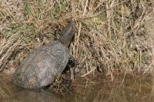 Espèce protégé. Carapace brun clair au noir avec des stries jaunes présentes également sur la tête et le cou. Pattes griffues et queue longue et fine. Espèce opportuniste lors de sa chasse dans l’eau, son alimentation constituée d’invertébrés aquatiques, de mollusques, de larves d’amphibiens, voire de cadavres. Hiberne dans la boue. Ponte constitué de 4 à 16 œufs, faite dans un trou creuser. Les petits se débrouillent seuls à la sortie.